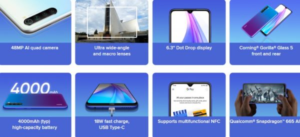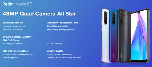 Redmi Note 8 T získava 6.3 palcový displej s rozlíšením Full HD+, v pomere 19.5 : 9, displej pokrýva až 90% prednej časti smartfónu, u modelu Redmi Note 7 to bolo 86%. Smartfón má veľmi tenké rámčeky na bočných stranách. Procesorom nového smartfónu je Snapdragon 665. Snímač otlačkov prstov sa nachádza na zadnej strane smartfónu, je rýchlejší ako u modelu Redmi Note 7, je ale aj menší o 30%, podľa spoločnosti podoba je harmonickejšia s dizajnom smartfónu. V spodnej časti prednej strany sa nachádza aj názov značky Redmi. Interné úložisko smartfón obsahuje na úrovni 64GB, alebo 128GB, RAM na úrovni 4GB, či 6GB. U tohto modelu v porovaní s modelom Redmi Note 8, pribudlo konečne NFC! Oproti modelu Redmi Note 8, model Redmi Note 8T v balení ponúka ešte rýchlejšiu 18W nabíjačku.