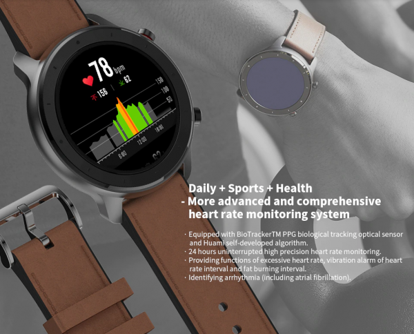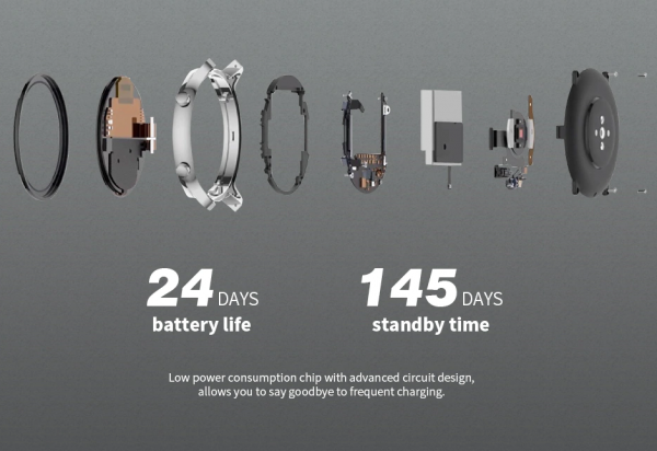 Hodinky s priemerom 47 mm obsahujú batériu s kapacitou 410 mAh, ktorá zaručuje výdrž až 24 dní normálneho používania – neustále automatické monitorovanie tepovej frekvencie, monitorovanie spánku, notifikácie, z času na čas zapnuté GPS (15.min denne).