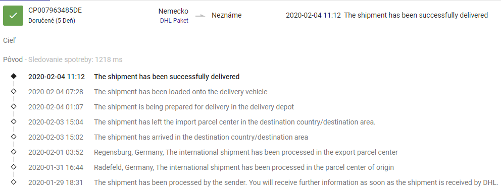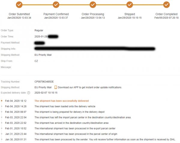 29.1. bol odoslaný DHLkom, doručený bol s prekvapením veľmi rýchlo už 4.2. Ešte deň pred doručením – 3.2., balík sa nachádzal v triediacom stredisku na SVK – vo večerných hodinách bol doručený -mail, že balík dorazí v nasledujúci deň 4.2. Produkt dokonca prišiel o 3 dni skôr, ako v predpokladanom termíne 7.2. Keďže sa produkt nachádzal v EU sklade, samozrejme ďalšie poplatky pri doručení účtované neboli. V deň doručenia samozrejme telefonoval kuriér.