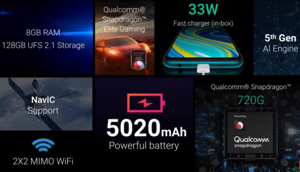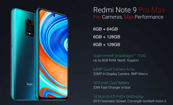 Smartfón Redmi Note 9 Pro Max získava 6.67 palcový Full HD+ displej, s pomerom 20:9. Smartfón na prednej aj zadnej strane chráni Gorilla Glass 5. Jeho procesorom je Snapdragon 720G, kedy tento model je prvým smartfónom značky Redmi, s procesorom série Snapdragon 7xx. nechýba RAM s kapacitou 6 až 8 GB. Interné úložisko je na úrovni 64GB alebo 128GB. Výbornou správou je, že úložisko je typu UFS 2.1, ktoré dosahuje rýchlosť čítania z úložiska na úrovni približne 800 – 900 MB/s, zatiaľ čo v bežných smartfónoch, ktoré majú typ UFS 2.0 rýchlosť dosahuje približne do 400 MB/s. Z tohto hľadiska aj načítavanie aplikácii a ich odozva bude ešte rýchlejšia. Poriadnou výhodou je samostatný slot pre 2 sim karty + ďalší samostatný slot pre Micro SD kartu, čiže spolu 3 sloty, nie 2.