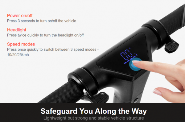 Uvedenej kolobežke nechýba dojazd na úrovni 25 kilometrov, jej rýchlosť je na úrovni 25 km / hod. Kolobežke taktiež nechýba displej. Nosnosť je na úrovni 100 kilogramov.