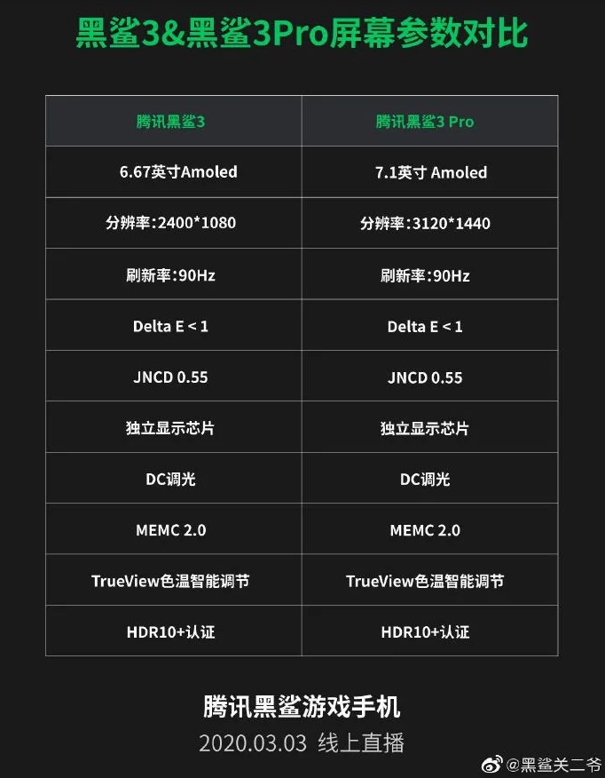Zatiaľ čo Black Shark 3 získa 6.67 palcový AMOLED displej s rozlíšením 2400 x 1080 pixelov, bude predstavená aj verzia Black Shark 3 Pro, ktorá získa až 7.1 palcový displej s rozlíšením 3120 x 1440  pixelov. Obom smartfónom nebude chýbať obnovovacia frekvencia displeja a úrovni 90 Hz. Okrem toho nové modely získajú úplne nové umiestnenie fotoaparátov na zadnej strane.