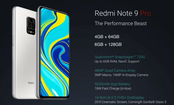 Smartfón Redmi Note 9 Pro získava 6.67 palcový Full HD+ displej, s pomerom 20:9. Smartfón na prednej aj zadnej strane chráni Gorilla Glass 5. Jeho procesorom je Snapdragon 720G, kedy tento model je prvým smartfónom značky Redmi, s procesorom série Snapdragon 7xx. nechýba RAM s kapacitou 4 a 6GB. Interné úložisko je na úrovni 64GB alebo 128GB. Poriadnou výhodou je samostatný slot pre 2 sim karty + ďalší samostatný slot pre Micro SD kartu, čiže spolu 3 sloty, nie 2.