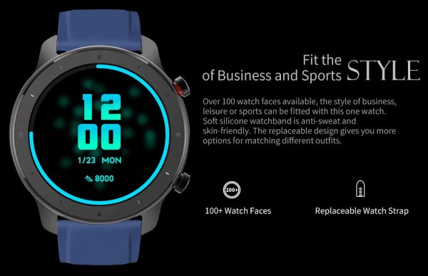 Hodinky s priemerom 47 mm obsahujú batériu s kapacitou 410 mAh, ktorá zaručuje výdrž až 24 dní normálneho používania – neustále automatické monitorovanie tepovej frekvencie, monitorovanie spánku, notifikácie, z času na čas zapnuté GPS (15.min denne). Nechýba hodinkám vodotesnosť do hĺbky 50 metrov. Samozrejmosťou je možnosť vymieňať remienky za vlastné, nové.