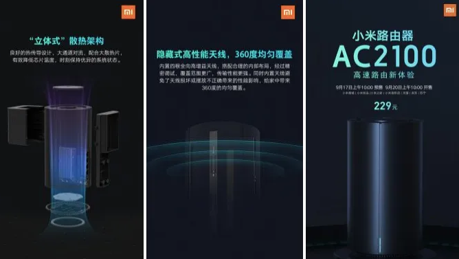 Xiaomi Mi AC2100 router získava 1000 Mbps ethernet port, ktorému nechýba dvojpásmová Wifi vo frekvenciách 2.4 GHz alebo 5GHz. Rovnako ako u iných Xiaomi routrov aj novému modelu nechýbajú 4 antény so 6 kanálovým zosilňovačom signálu. Vstavané antény sú navrhnuté tak, aby neznižovali signál alebo jeho pokrytie spôsobené nesprávnym umiestnením. Všetko je to vďaka efektívnemu kužeľovitému tvaru. Na prednej strane nový router obsahuje dve LED svetlá, ktoré indikujú stav zariadenia.