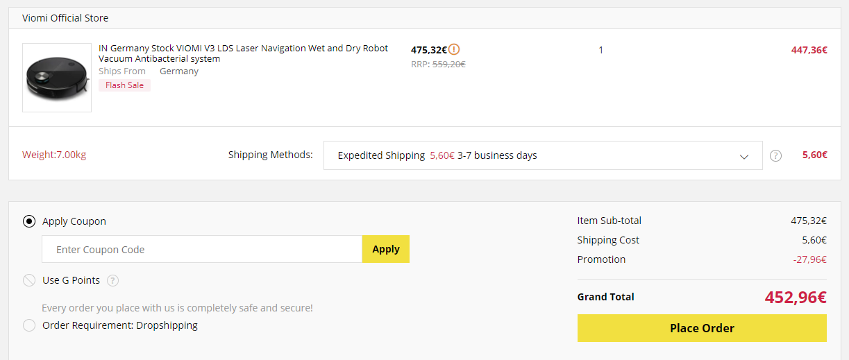 Cena v nemeckom sklade sa pohybuje na úrovni 475.32€, pridaním produktu do košíka sa aplikuje zľava, kedy cena klesne na hodnotu: 447.36€, poštovné je v cene 5.60€. Keďže produkt sa nachádza v EU sklade, ďalšie poplatky navyše pri doručení neplatíte. Tip: Z EU krajín nikdy nebudeš platiť colné poplatky, prečo je to tak? Poznáme odpoveď. Presmerovanie na tento produkt do e-shopu prostredníctvom tlačítka nižšie nefunguje zo smartfónu, prosím použite prehliadač v tablete, najlepšie v pc/ v notebooku – tam presmerovanie funguje bezproblémovo.