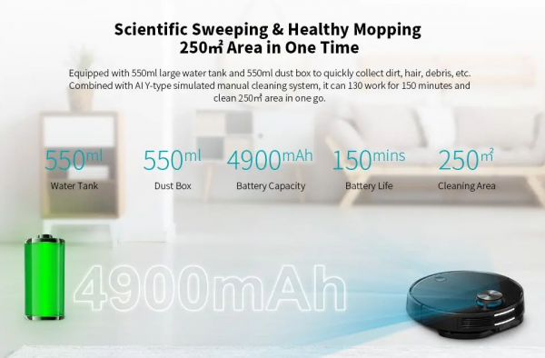 Jeho výkon je na úrovni až 2600 Pa. Vysávaču nechýba spárovanie s aplikáciou v smartfóne, nechýba aj vodná nádržka s kapacitou 550 Ml, odpadová nádržka má kapacitu 550 ml. Zdoláva prekážky o výške nie 1 cm, ale až 2 cm. Vďaka vylepšenému algoritmu je efektívnejší až o 30%. Obsahuje aj nový typ Y režimu mopovania, ktorý je efektívnejší ako klasický Skový. Kapacita batérie dosahuje úroveň ohromných 4900 mAh, vďaka ktorej vydrží až 150 minút používania. Dokonca je možné nastaviť či chcete vysávať súčasne umývať, vysávať, alebo len umývať bez vysávania.