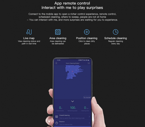 S aplikáciou Mi Home vysávač funguje bezproblémovo, možné je vidieť aj trasu vysávača, mapovanie miestnosti. Rovnako ako u prvej generácie nechýba automatický návrat na nabíjaciu stanicu, ak je slabá batéria, alebo ak vysávač dovysáva. Taktiež prídu aj notifikácie na smartfón, že dovysával. Robot prejde aj cez dverové lišty do výšky 1 – 2cm. Aplikácia v smartfóne tiež umožňuje vypočítať čas, ako dlho bude ešte robot vysávať daný priestor, nechýba nastavovanie časov v aplikácií pre automatické vysávanie. Samozrejmosťou je spustenie vysávania aj manuálne prostredníctvom tlačítka na vysávači. Keďže vysávač sa páruje s vašou Wifi sieťou v domácnosti prostredníctvom aplikácie v smartfóne Mi Home, vysávač môžete ovládať aj nadiaľku mimo domova.