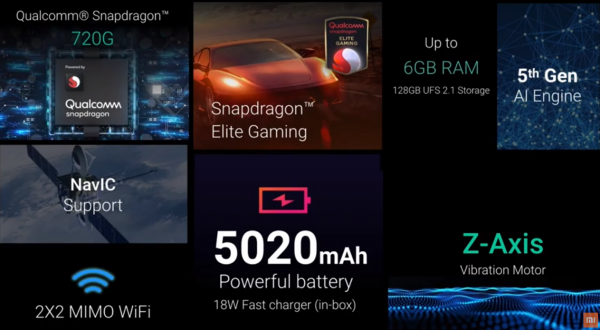 Smartfón získava batériu s kapacitou až 5 020 mAh, v porovnaní so 4 500 mAh batériou v smartfóne Redmi Note 8 Pro, je nový model ešte tenší. Smartfón získava aj podporu 18W rýchleho nabíjania. Hlavný fotoaparát smartfón získava 48, 8, 5, 2 megapixelový, zatiaľ čo predný je 16 megapixelový. Smartfónu nechýba odolnosť typu P2i chrániaca konektory voči vode.