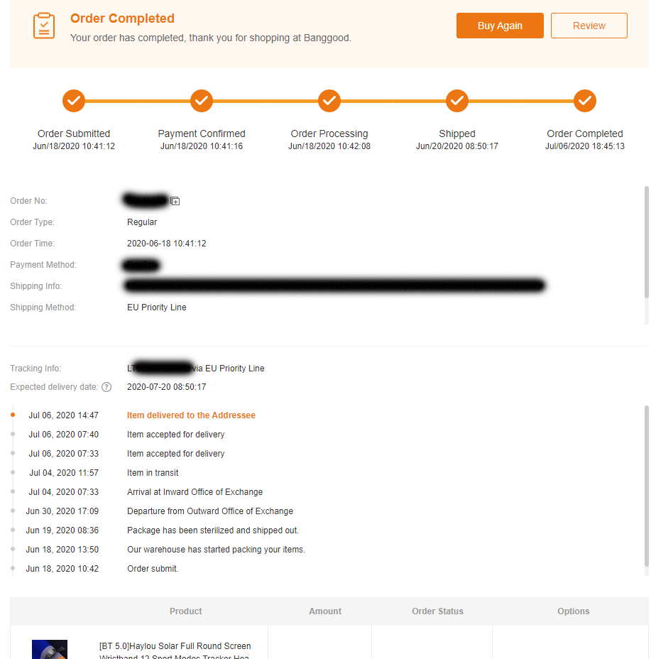 Doručený bol 6. júla. Celková doba doručenia od odoslania je 16 dní. Ako v iných prípadoch poštovného EU Priority Line, aj v tomto prípade balík dorazil bez zastavenia colnicou, bez ďalších poplatkov navyše pri doručení.