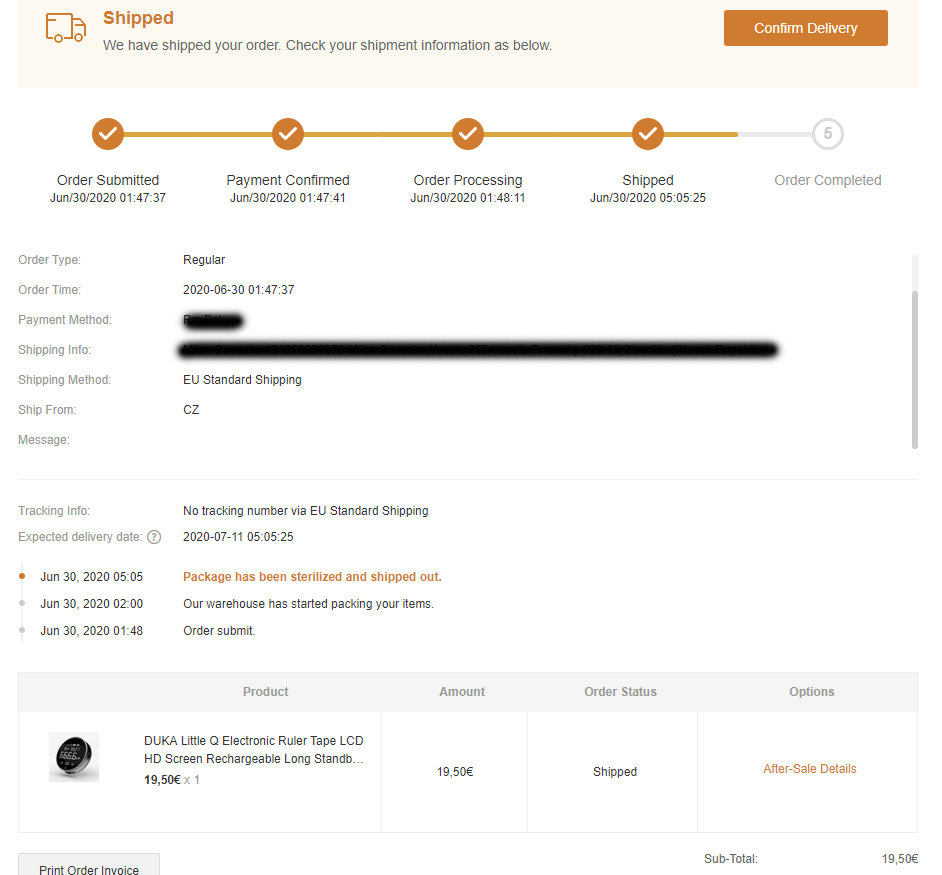 Objednávka ako aj produkt bol odoslaný 30. júna.