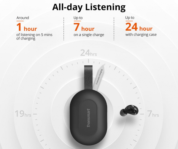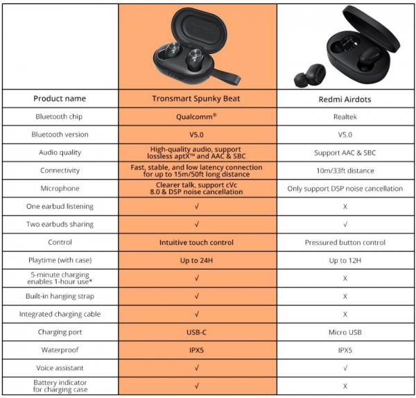 Tronsmart Spunky Beat získavajú lepší čip od spoločnosti Qualcomm, vďaka ktorému ponúkajú nižší odber spotreby energie, kvalitnejší zvuk. Na jedno nabitie vydržia až 7 hodín počúvania hudby, vďaka nabíjaciemu púzdru je ich možné nabiť až na ďalších 24 hodín. Nechýba im dotykové ovládanie, dokonca obsahujú aj certifikáciu IPX5, vďaka ktorej im neuškodí dážď. Dokonca nechýba aj podpora hlasových asistentov Siri alebo Google Asistent.
