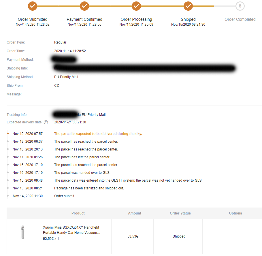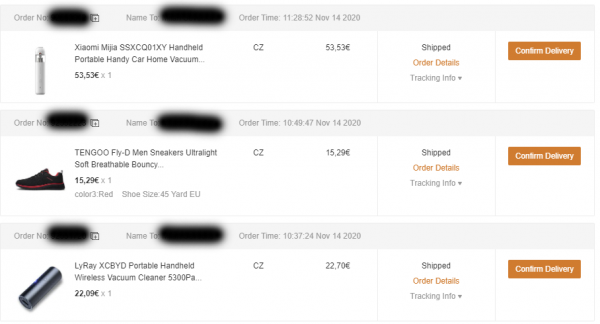 14. novembra sme na Banggoode vytvorili 3 samostatné objednávky z CZ skladu.