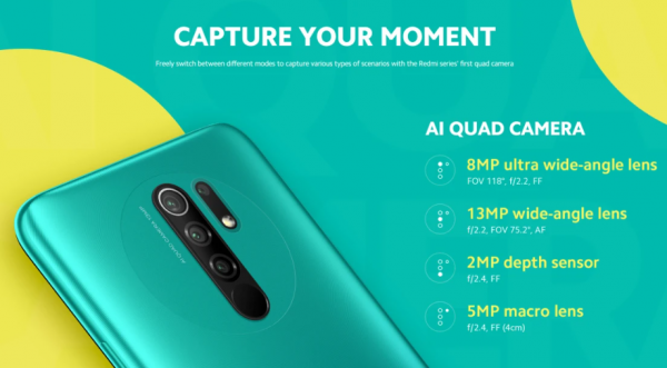 Redmi 9 získava 6.53 palcový displej s rozlíšením Full HD+, s pomerom na úrovni 19.5:9. Jeho procesorom je Helio G80, nechýba RAM s kapacitou 4GB, interné úložisko s kapacitou 64GB. Hlavný fotoaprát smartfón obsahuje 13, 8, 5, 2 megapixelový, predný fotoaparát obsahuje 8 megapixelový. Kapacita batérie dosahuje úroveň 5020 mAh, s podporou 18W nabíjania. Smartfón ako prvý zo série Redmi (Nie Note) obsahuje aj NFC modul. Smartfón je možné odomknúť na základe snímača otlačkov prstov na zadnej strane, alebo prostredníctvom rozpoznávania tváre majiteľa. Verzia je GLOBAL VERSION určená pre EU trhy, nechýbajú všetky siete, slovenčina, aktualizácie.