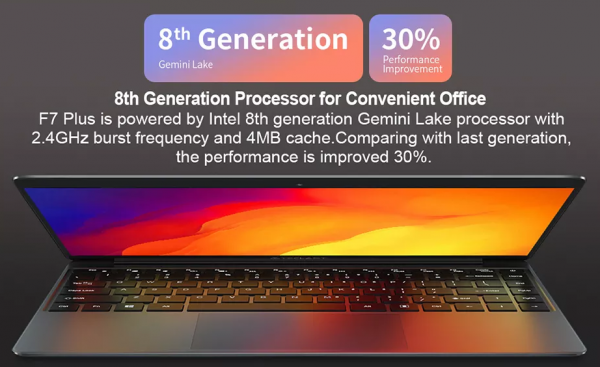 Ultrabook Teclast F7 Plus získava 14 palcový displej s rozlíšením Full HD. Procesorom notebooku je Intel Gemini Lake N4100 s Turbo Boost až do frekvencie 2.4 GHz. Novému ultrabooku nechýba interné úložisko typu SSD s kapacitou 256GB, RAM na úrovni 8GB. Predný fotoaprarát ultrabook obsahuje 2 megapixelový. Nechýba mu podsvietená klávesnica, 2x USB 3.0, audio jack, DC Jack, slot pre Micro SD karty, Mini HDMI port. Jeho logo na zadnej strane svieti.