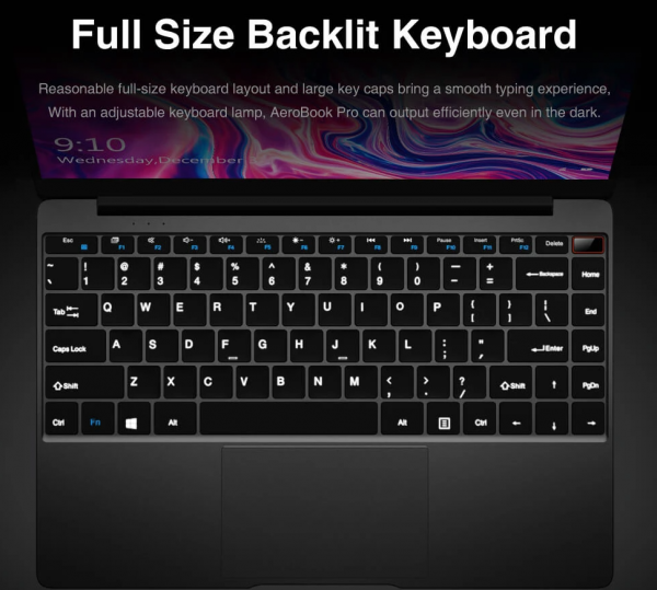 Chuwi Aerobook Pro získava 13.3 palcový IPS displej s rozlíšením Full HD. Jeho procesorom je Intel M3-8100Y. Kapacitu RAM získava na úrovni 8GB, interné úložisko na úrovni 256GB typu SSD – M.2. Spoločnosť udáva výdrž na jedno nabitie na úrovni 8 hodín. Získava dva USB 3.0 porty, slot pre Micro SD karty, audio jack, Mini HDMI, aj USB C port. Nechýba plná licencia Windows 10 so všetkými jazykmi. Wifi obsahuje duálnu s maximálnou prenosovou rýchlosťou na úrovni 867 Mbps.