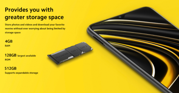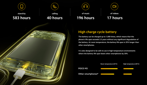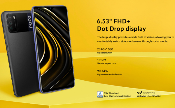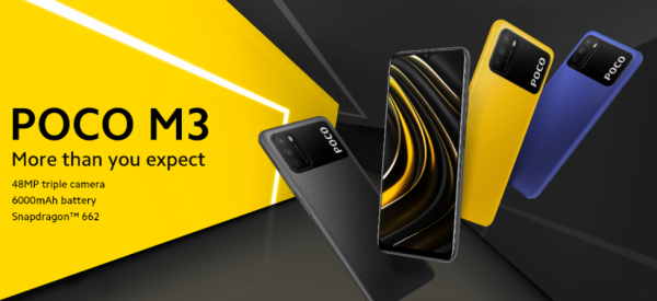 Poco M3 získava 6.53 palcový Full HD+ displej, ktorý pokrýva až 90.34% prednej plochy. Jeho procesorom je Snapdragon 662, nechýba RAM s kapacitou 4 GB, interné úložisko s kapacitou 128GB rýchlejšieho úložiska typu UFS 2.2. U 64GB verzie je pomalší typ úložiska 2.1. Práve rýchlejšie úložisko zaistí rýchlejšie načítavanie systému, aplikácii, rýchlejšia inštalácia aplikácii. Smartfón má až 3 sloty – 2 sloty na sim kartu, ďalší samostatný slot pre Micro SD kartu.  Hlavný fotoaparát smartfón obsahuje 48, 2, 2 megapixelový, predný fotoaparát 8 megapixelový. Batéria dosahuje úroveň ohromných 6000 mAh. Smartfón obsahuje snímač otlačkov prstov na bočnej strane.