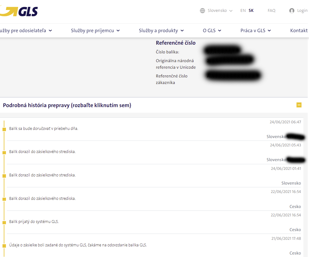Hneď na ďalší deň 22. júna balík prebrala kuriérska spoločnosť GLS. Pri tovare z CZ skladu nezabudnite vždy vybrať poštovné EU Priority Mail, alebo EU Priority Line, ktoré s určitosťou cestuje GLSkom. V našom prípade sme tentokrát vybrali poštovné EU Priority Line z českého skladu.