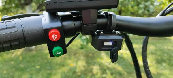Na riadidlách tiež nechýba tlačítko pre zapnutie svetla, klaksón, ale nájdeme tu aj USB pre nabíjanie napríklad smartfónu.