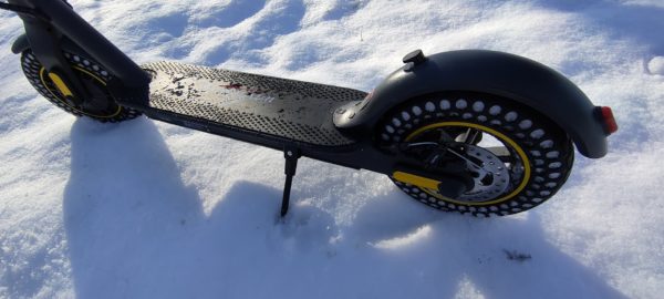 Brzdy kolobežka má dokonca kotúčové. Pneumatiky sú 10 palcové, bezdušové.