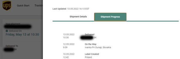 Kuriérska spoločnosť UPS balík prebrala 10. mája. Balík bol úspešne doručený 13. mája. Celková doba dodnia od odoslania bola 3 dni. Keďže produkt sa nachádzal v EU sklade, ďalšie poplatky navyše pri doručení sme neplatili.  Tip: Z EU krajín nikdy nebudeš platiť colné poplatky, prečo je to tak? Poznáme odpoveď.