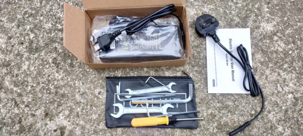 V jej balení sa nachádza EU adaptér pre nabíjanie, potrebné kľúče pre dotiahnutie riadidiel.