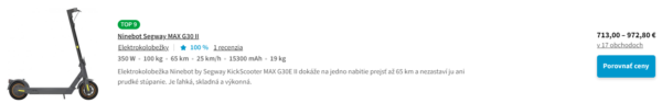 Ak kolobežku porovnáme s konkurenciu, na trhu máme napr. Ninebot Segway G30 v cene 713€, ušetríte tak 144€.