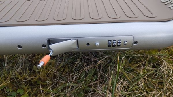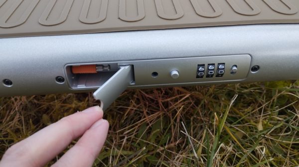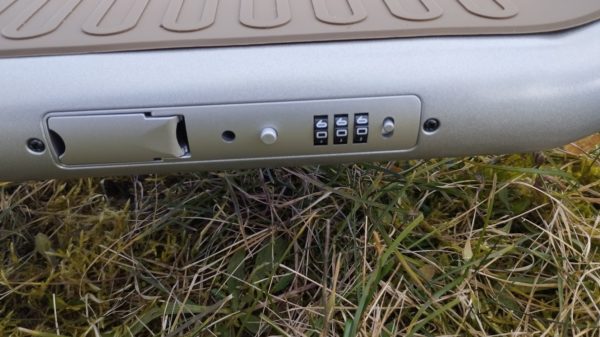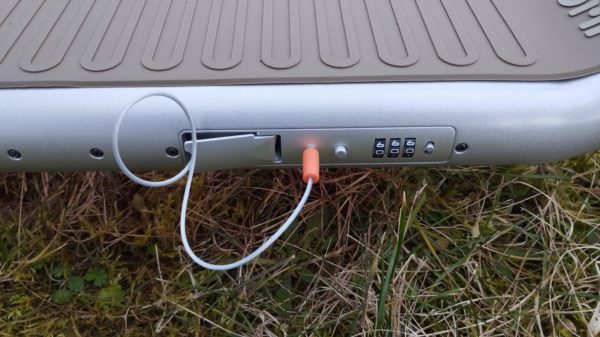 Oproti konkurencii je tu ale jedna poriadne skvelá vec. Kolobežke nechýba integrovaný zámok. Prednastavené heslo je 000, ale jednoducho ho zmeníte. Ako môžete vidieť na pravej strane od číselníka je prepínacie tlačidlo, ak sa prepne, tým pádom nastavíte vlastný kód a znovu to tlačidlo prepnete naspäť.