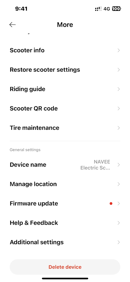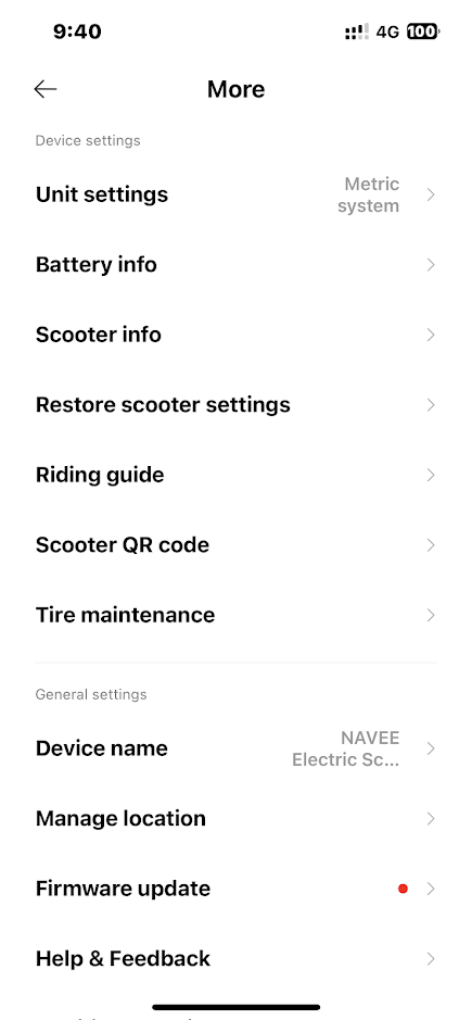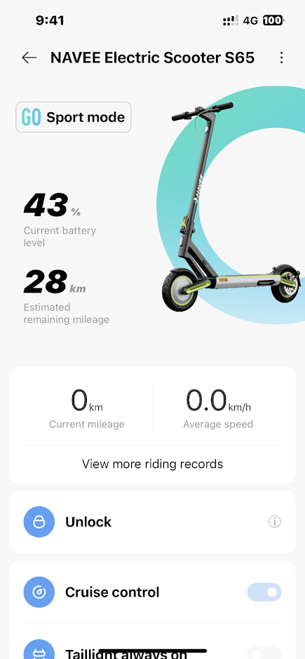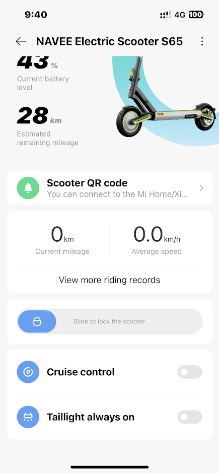 Cez aplikáciu dokážete kolobežku zamknúť, nastaviť tempomat, kedy po 8 sekundách jazdy kolobežka pípne a ťahá sama. Tempomat sa deaktivuje stlačením brzdy. Taktiež je možné cez aplikáciu nastaviť svietenie vždy po zapnutí.