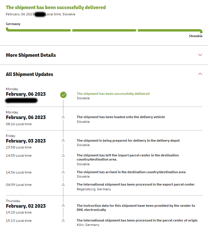 Kuriér kolobežku prebral 3. februára, doručená bola 6. februára. Celková doba doručenia od odoslania boli 3 dni.
