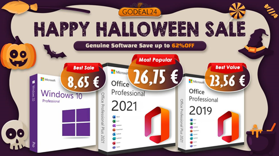 Halloweensky výpredaj kancelárskych aplikácii od GODEAL, až 62% zľavové kupóny: Windows 10 Pro len 8.65€, doživotná licencia Microsoft Office od 20.49€