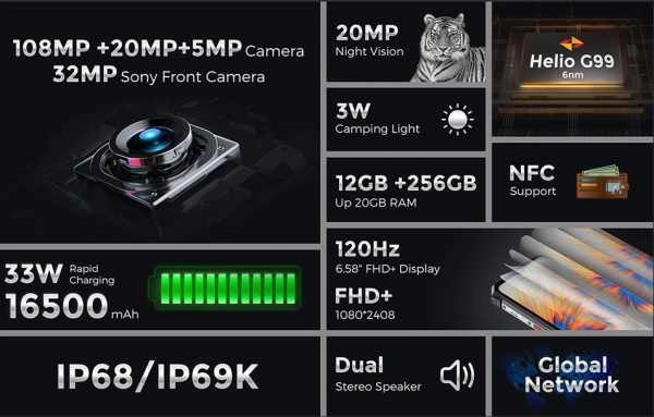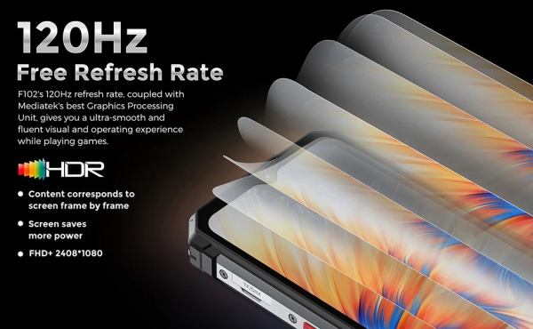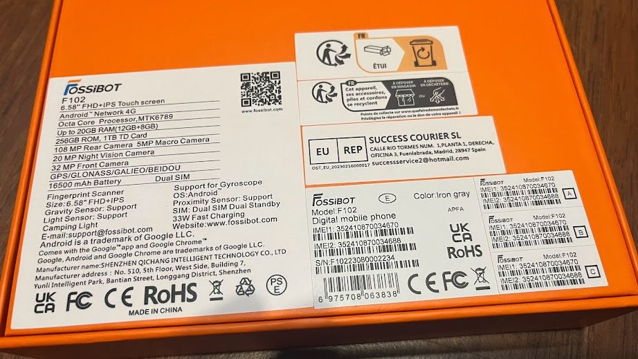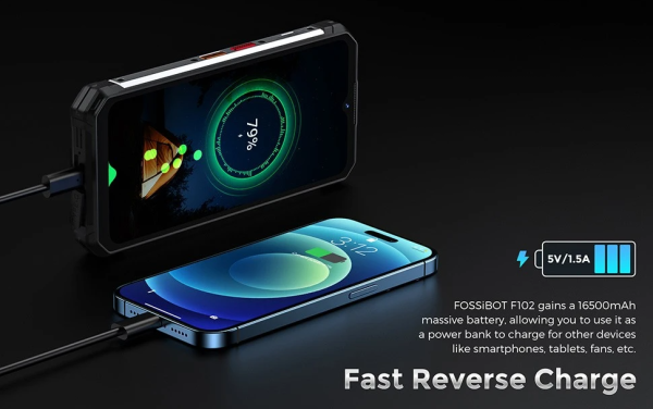 Smarfón FOSSiBOT F102 útočí v najlepšom pomere cena / výkon vďaka kombinácii funkcii, ktoré obsahuje. 6.58″ Full HD+ displej je veľmi pekný pri používaní, ktorý ponúka bohaté farby. A nielen to, na displeji je už od výroby nalepené ďalšie ochranné sklo Dragontrail. Čiže dokupovať ďalšie ochranné sklo nemusíte. Displej dokonca obsahuje obnovovaciu frekvenciou 120 Hz. Vďaka použitiu procesora Mediatek Helio C99 vyrábaného 6 nm technológiou smartfón poskytuje vysoký výkon, pri zachovaní nízkej spotreby energie, no v kombinácii s obrovskou 16 500 mAh batériou vám vydrží extrémne dlhú dobu  pohotovostnom režime. Navyše dokáže nabíjať aj iné zariadenia, práve vďaka obrovskej kapacite batérie. Máme tu 256GB interné úložisko, 12GB RAM rozšíriteľná o 8GB RAM v systéme. Hlavný fotoaparát smartfón obsahuje 108 megapixelový, predný fotoaparát až 32 megapixelový. Celkovo tak máte 20GB RAM. Možné je použiť 2 SIM karty, aleboo 1 SIM +  Micro SD kartu. Vďaka certifikácii IP68/IP69K, je smartfón vodotesný a prachu vzdorný. Nechýba podpora NFC platieb. Určený je pre EU trh, s EU adaptérom, slovenčina, aktualizácie.