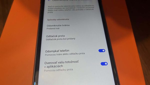 • Smartfón je možné odomknúť snímačom otlačkov prstov na pravej strane, alebo odomknutie tvárou. Možné je nastaviť aj funkciu zodvihnutím zobudiť, kedy sa displej automaticky zobudí po zodvihnutí, tým pádom ihneď sa smartfón odomkne na základe rozpoznania tváre