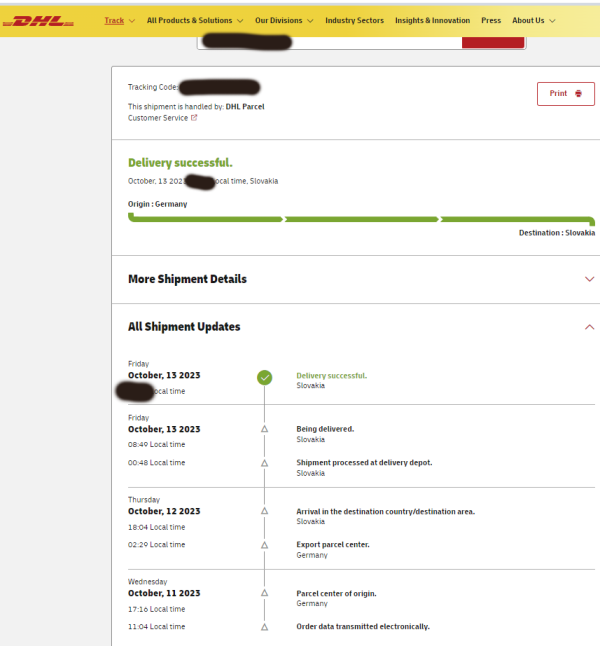 11. októbra 2023 bol smartfón odoslaný z nemeckého skladu. Úspešne doručený bol 13. októbra 2023. Celková doba dodania od odoslania boli 2 dni. Keďže produkt sa nachádzal v EU sklade, ďalšie poplatky navyše pri doručení sme neplatili.