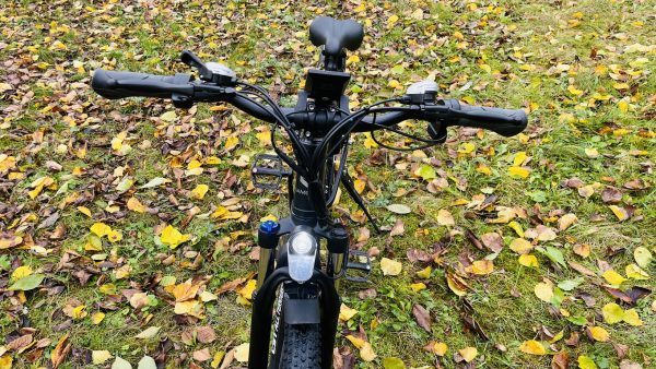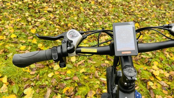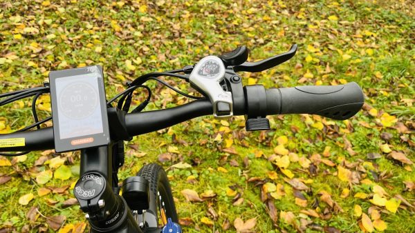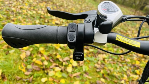 Na ľavej strane riadidiel sa nachádza brzda, klaksón, tlačidlá pre prepínanie režimov jazdy, zo spodnej strany, pod šípkami sa nachádza tlačidlo pre zapnutie e-biku