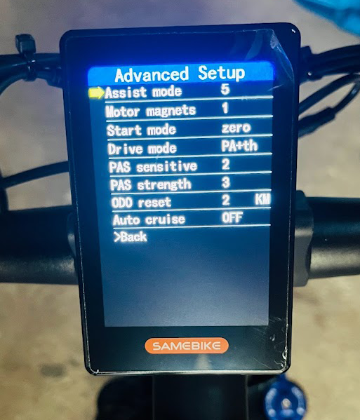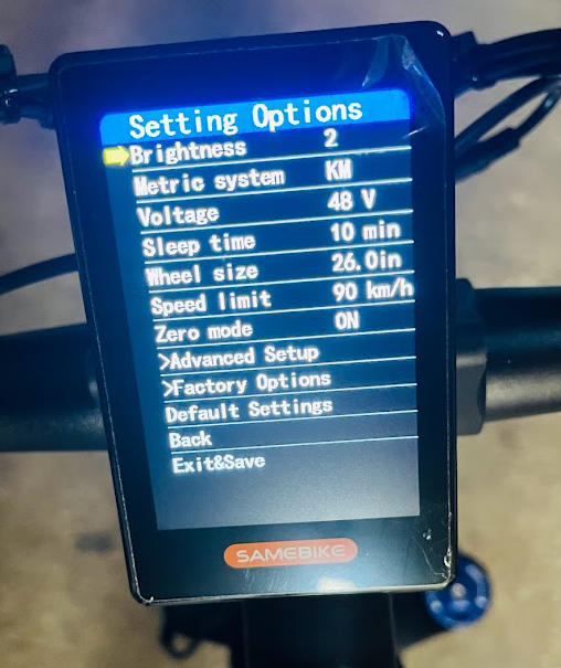 E-bike obsahuje aj skryté menu, ktoré sa aktivuje podržaním šípok, tam je možné nastaviť maximálnu rýchlosť z 25 km / hod. na vyššiu, pri teste e-bike dosahuje rýchlosť cca 42 km / hod. pri jazdcovi s váhou 86 kg, v skrytom menu je možné aj aktivovať alebo deaktivovať zero štart, kedy e-bike ťahá od 0 km / hod. stlačením akcelerátora