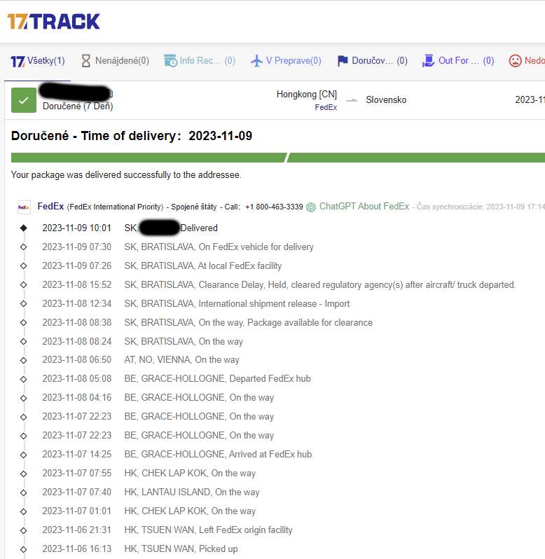 Dron bol odoslaný 6. novembra 2023 z čínskeho skladu. Úspešne doručený bol 9. novembra 2023. Celková doba dodania od odoslania boli 3 dni. Balík dorazil Fedex kurérom bez poplatkov navyše.
