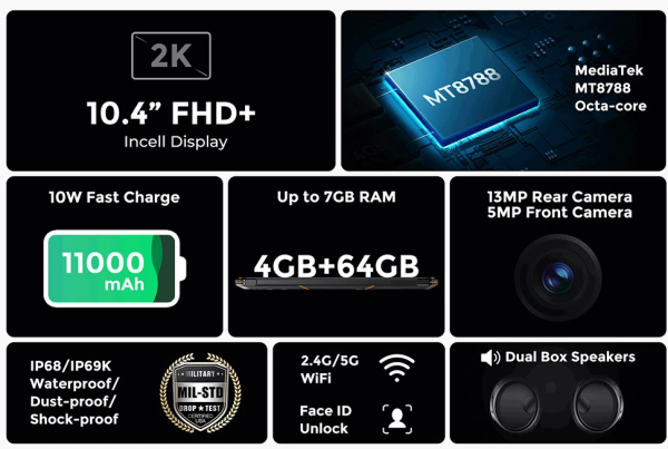 - Vďaka certifikácii IP68/IP69K, je tablet vodotesný a prachu vzdorný
