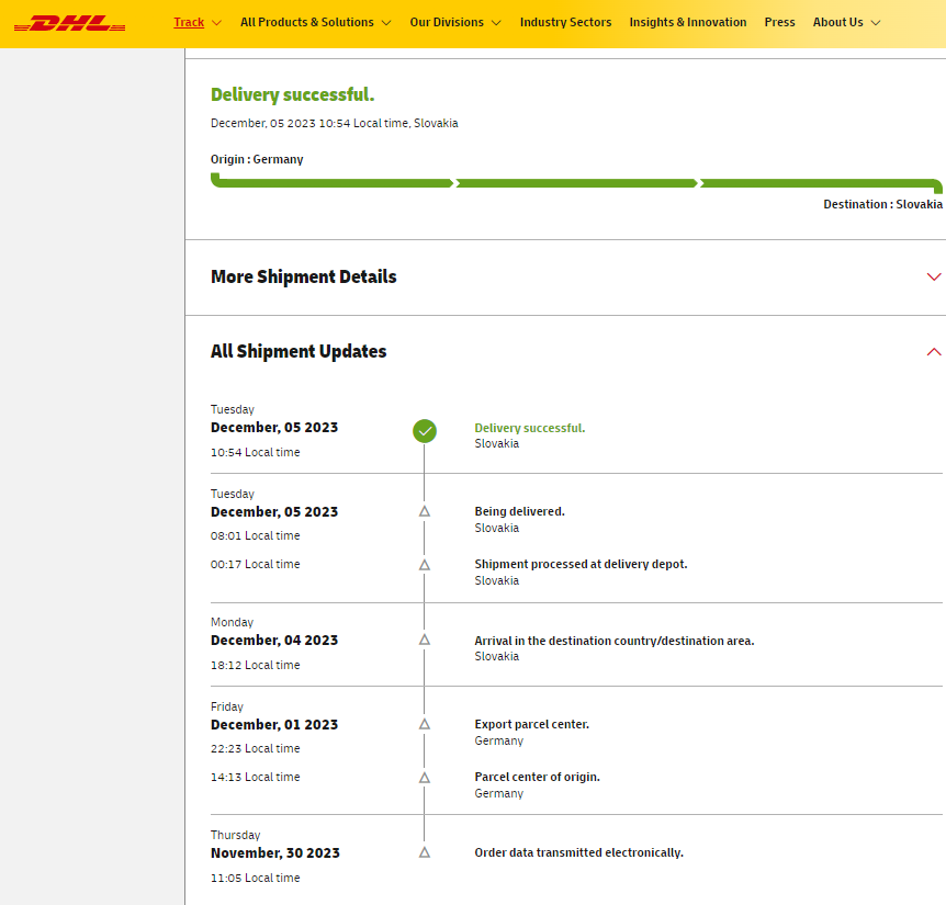 1. decembra 2023 bol tablet odoslaný z Nemecka. Úspešne doručený na adresu bol 5. decembra. Celková doba dodania od odoslania boli 4 dni.