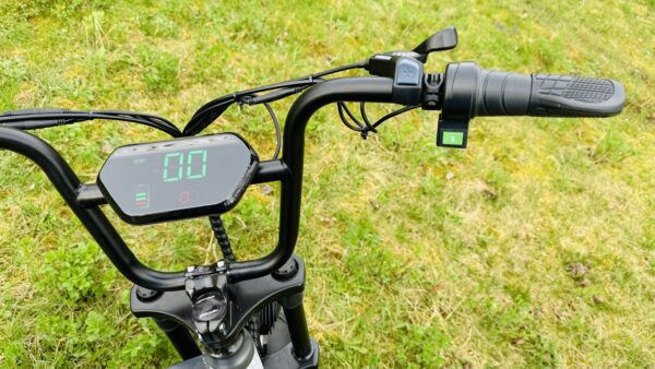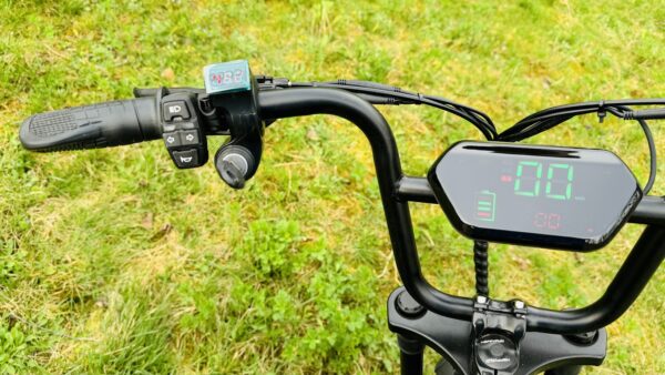 Na pravej strane sa nachádza akcelerátor, tlačidlo pre prepínanie 3 režimov jazdy. E-bike „ťahá“ od 3 km / hod.