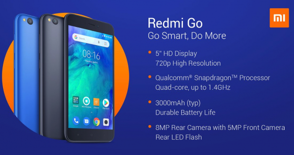 Nový model smartfónu Redmi Go získava 5 palcový displej, v pomere 16:9, s rozlíšením HD. Procesorom nového smartfónu je Snapadragon 425, nechýba RAM s kapacitou 1GB, interné úložisko s kapacitou 8GB, ktoré je možné rozšíriť prostredníctvom Micro SD kariet. Hlavný fotoaparát smartfón získa 8 megapixelový, predný fotoaparát 5 megapixelový. Kapacita batérie dosahuje úroveň 3 000 mAh. Smartfón prichádza vo farebných prevedeniach: čierna, modrá. Operačným systémom smartfónu je Android Go Edition.